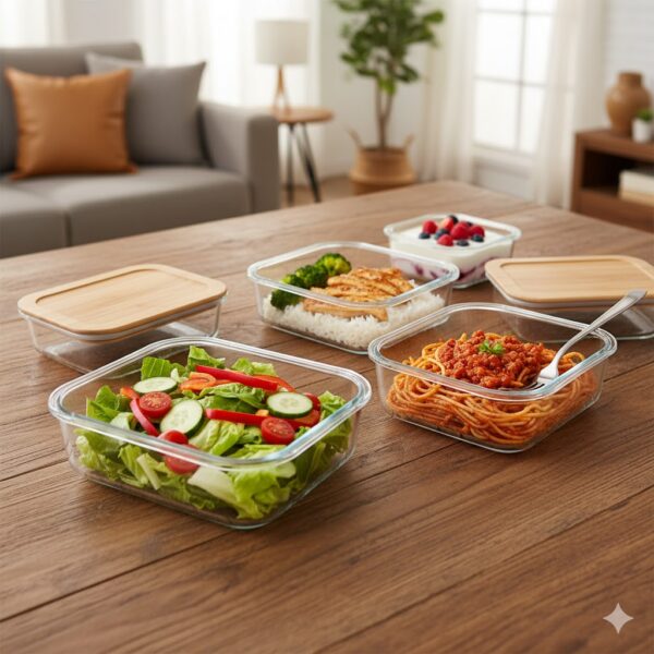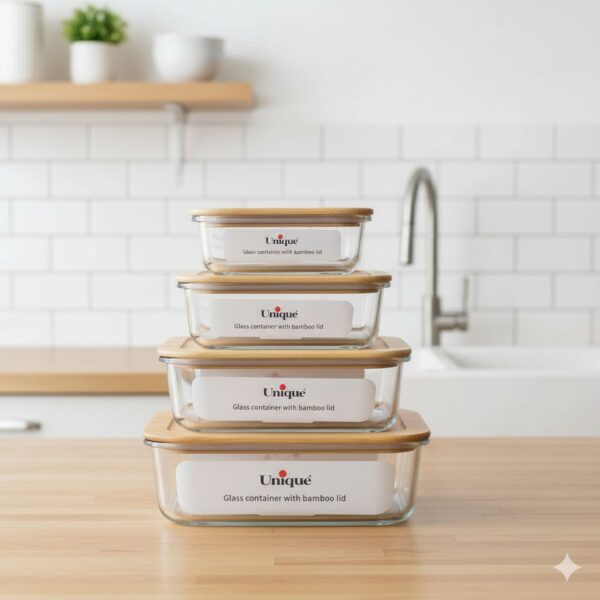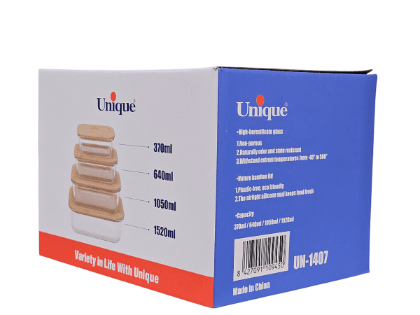 ظرفیت ظروف : 370 میل – 640 میل – 1050 میل – 1520 میل ، قابلیت استفاده در : فریزر – فر و ماکروویو ، جنس درب : بامبو ، جنس ظروف : پیرکس ، قابلیت شستشو : ماشین ظرفشویی